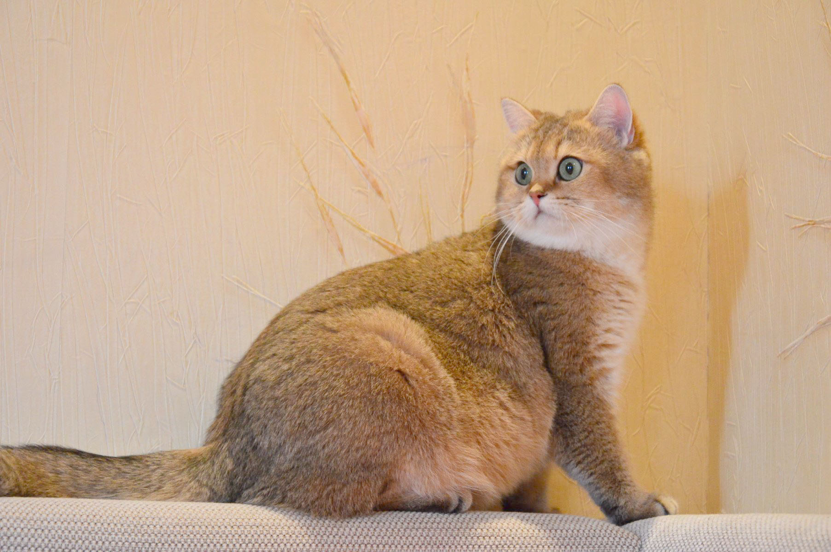Golden British Cat With Rich Green Eyes And Fluffy Whiskers Looks Up Close Up Female British Shorthair Cat Bri Ny 25 Black Golden Ticked Stock Photo Alamy